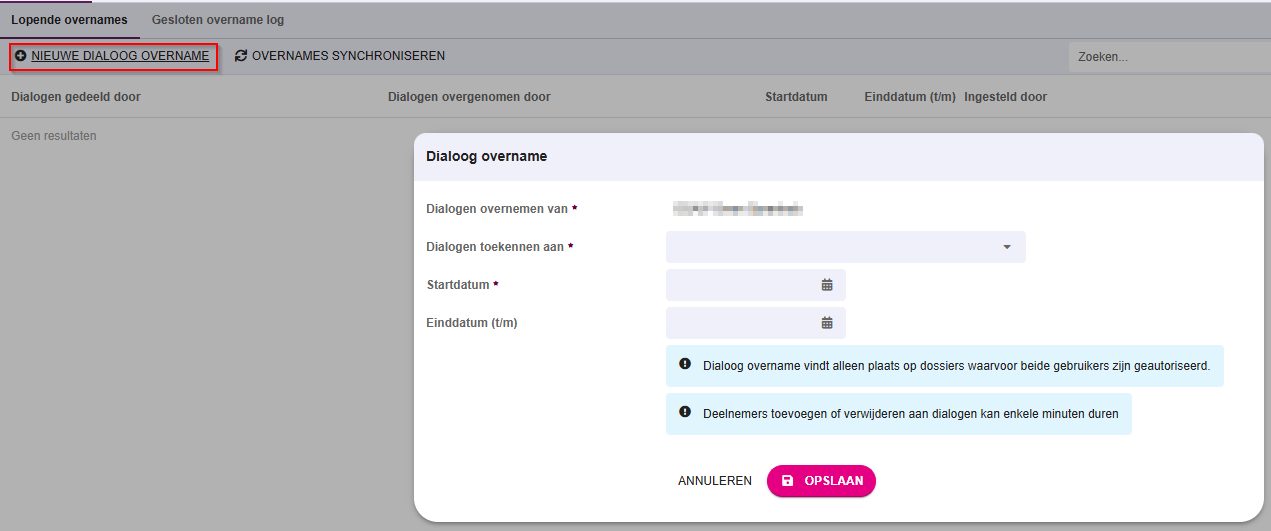 Het is ook mogelijk om dialogen ( Veilig communiceren) over te laten nemen. Klik hiervoor op de knop "Dialoog overname registreren". Klik vervolgens op "Nieuwe dialoog overname" en vul het opgekomen scherm in. Sla deze vervolgens op.