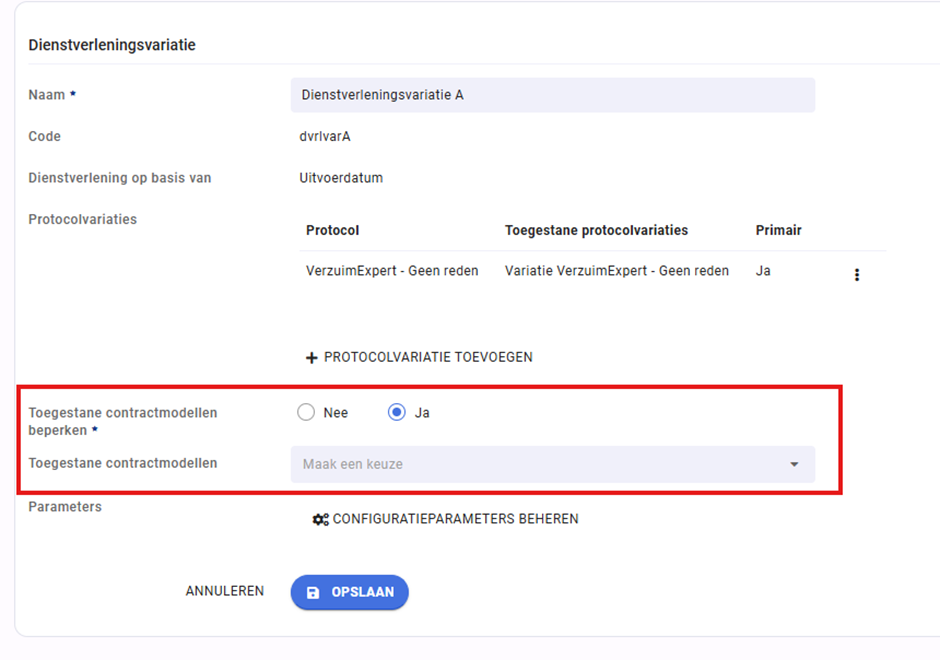 - Koppel hieraan de dienstverlening. Wanneer je de dienstverlening hebt geselecteerd, klik dan op ‘Dienstverleningsvariatie toevoegen’. Vervolgens kan je het contractmodel kiezen.