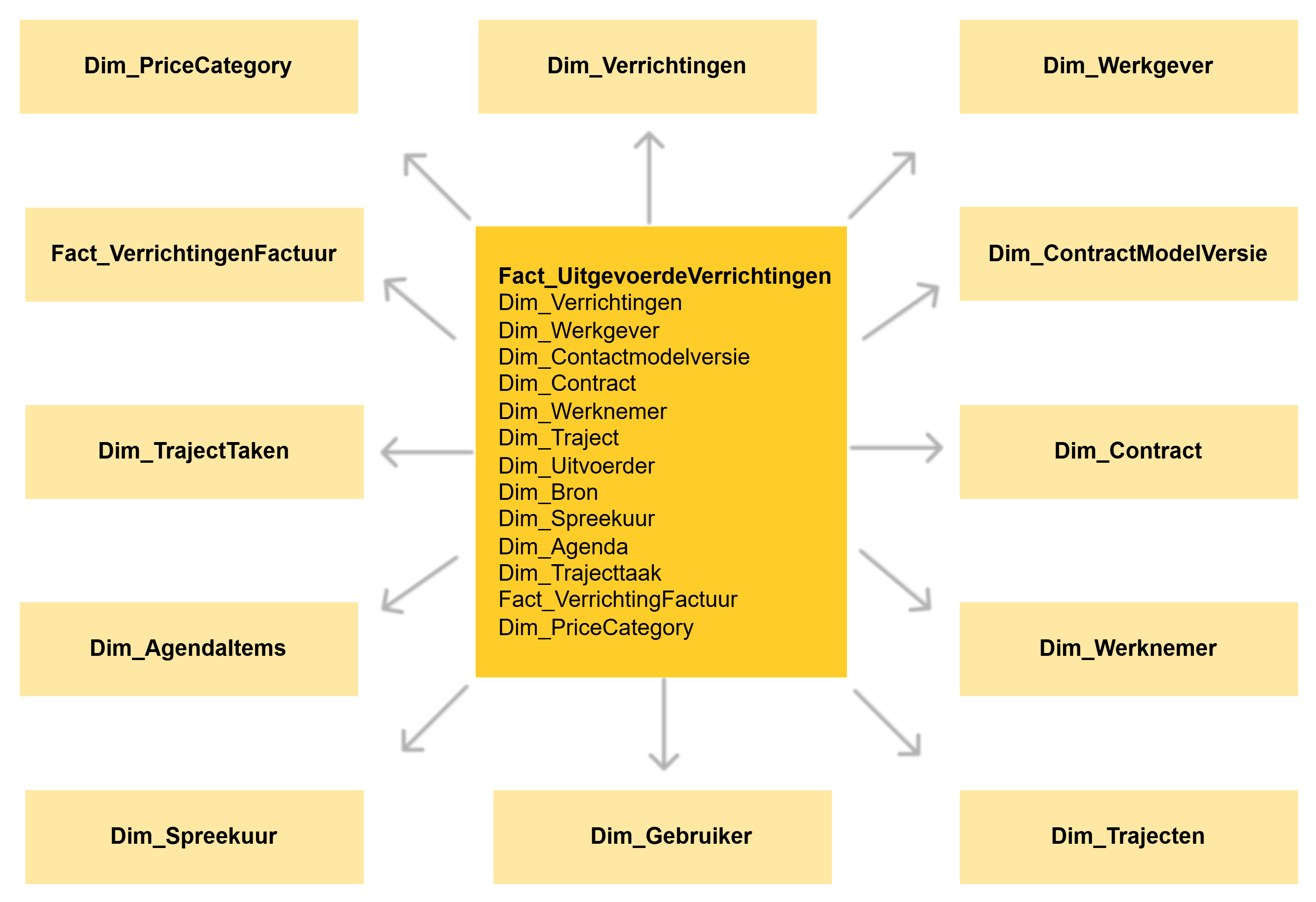 Hiermee vormt Fact_UitgevoerdeVerrichtingen de schakel tussen planning en uitvoering (agenda/spreekuur/taak), de organisatorische context (werknemer/werkgever/traject) en de contractuele en financiële vastlegging (contract/modelversie/price category en factuur).