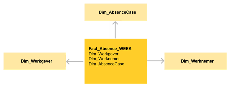 Met het feitenbestand Fact_Absence_Week wordt per week inzicht gegeven in het totaal aantal verzuimdagen en het aantal verzuimdagen met een attest op basis van de afwezigheidsperiodes. Deze feitentabel legt de relatie tussen de werknemer (Dim_Werknemer), de werkgever (Dim_Werkgever) en het bijbehorende verzuimdossier (Dim_AbsenceCase).