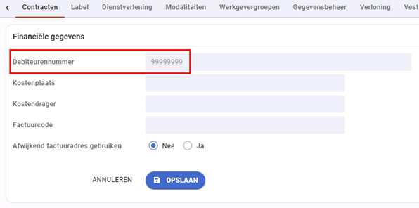 - Ga naar het tabblad ‘Contracten’ en vul een Debiteurennummer in.