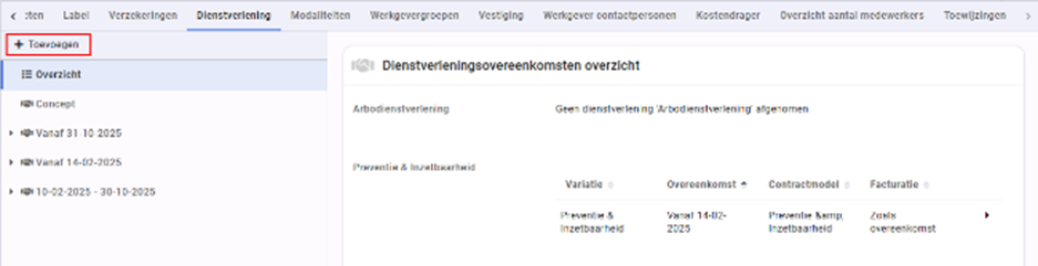In de dienstverleningsovereenkomst met de werkgever wordt vastgelegd welke dienstverleningsvariaties worden afgenomen en over welke periode. De gekozen dienstverleningsvariaties bepalen nu welke trajecten kunnen worden gestart en welke spreekuursoorten mogen worden ingepland. Hiermee worden de instellingen van protocollen en variaties die in de organisatiestructuur zijn ingericht genegeerd.