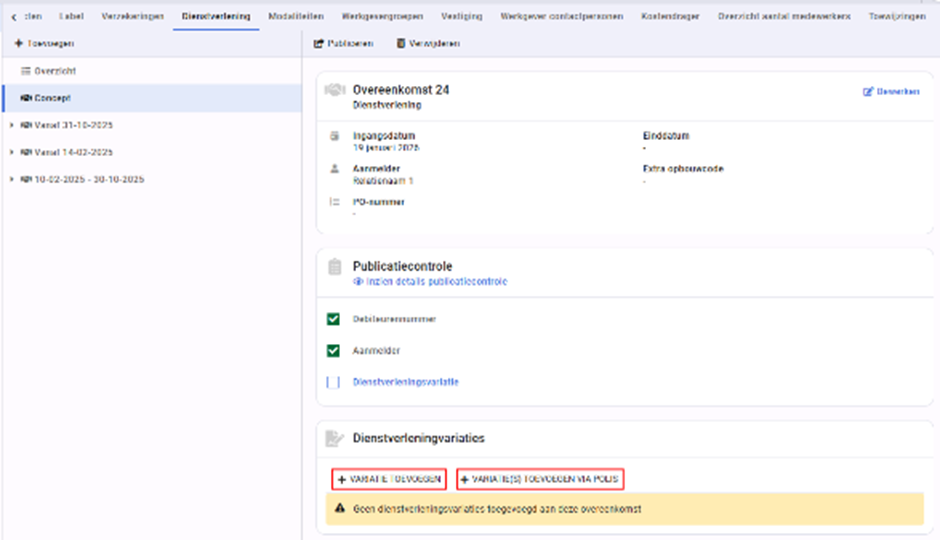 Let op, na publicatie is het niet meer mogelijk om dienstverleningsvariaties te bewerken of de overeenkomst te verwijderen. Wel blijven de gegevens en de facturatie van de overeenkomst zelf aanpasbaar, evenals de ingangsdatum, aanmelder, het budget en de extra opbouwcode.