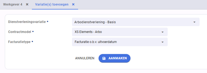 Let op, bij het toevoegen van ‘Variatie(s) toevoegen via polis’ wordt de facturatiewijze automatisch gezet op basis van de uitvoerdatum. Ook het contractmodel wordt automatisch ingesteld. Deze gegevens kunnen nog worden gewijzigd.