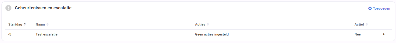 Bij het beheren van een taak is een panel toegevoegd, genaamd ‘Gebeurtenissen en escalatie’. Hierin is het overzicht te zien van alle gebeurtenissen die plaatsvinden op een moment gerelateerd aan de startdag van de nog lopende taak. Je ziet hier de startdag en naam van de taakgebeurtenis, welke acties er zijn ingesteld en of de taakgebeurtenis wel of niet actief is.