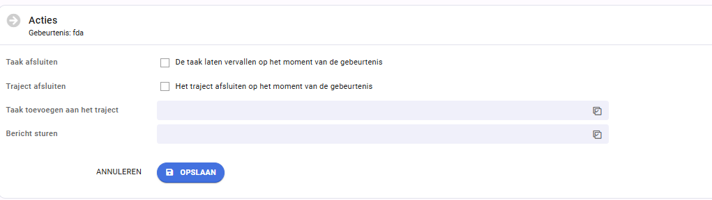 Wanneer je op opslaan klikt, is de taakgebeurtenis aangemaakt en wordt het overzichtsscherm van de taakgebeurtenis geopend. Hier is te zien dat de taakgebeurtenis nog geen acties heeft en nog niet is geactiveerd.