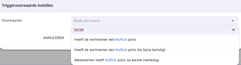Er zijn trigger voorwaarde beschikbaar, deze zijn in het trigger-beheer te gebruiken om een taak toe te voegen (bijvoorbeeld bij de ziekmelding) om te signaleren dat er wellicht nog wel een no-risk polis speelt. Alleen bij werknemers waar er is vastgelegd dat er expliciet wel of expliciet geen no risk polis van toepassing is krijgen deze taak dan niet bij een nieuwe ziekmelding.