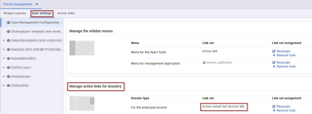 Selecteer de relevante gebruikersgroep/rol en klik onder "Beheer actielinks voor dossiers" op de ingestelde linkset voor het werknemersdossier.