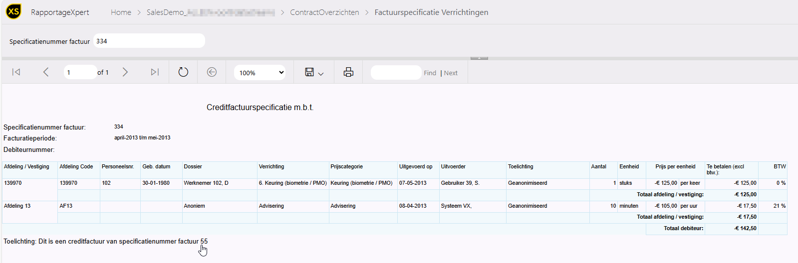 In het rapport 'Controle_Verrichtingen' wordt de gecrediteerde - en de gerelateerde verrichting bij elkaar getoond onder de status 'Gecrediteerd'. In het rapport 'Factuurspecificatie_Verrichtingen' is het duidelijk zichtbaar gemaakt dat het een creditfactuur betreft, met een verwijzing naar de originele factuur en vice versa.